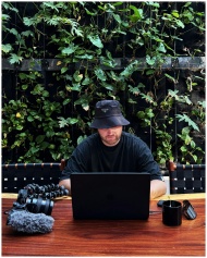 Man with laptop in outdoor café, surrounded by plants, embodying remote work lifestyle in Mexico.