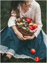 A woman in vintage dress holding a basket of apples, sitting on grass in a countryside setting.