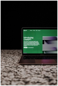 Laptop showing ChatGPT interface on a marble surfa