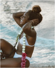 Bright and joyful moment by the ocean with a woman in a bikini enjoying the beach and sea breeze.