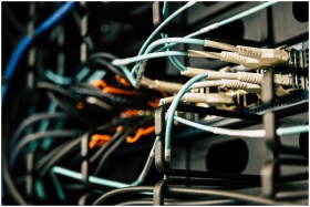 Various tangled wires connected to system near black metal cases in server room