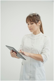 A female medical professional in white uniform using a tablet in a clinical setting.