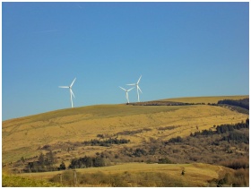 Scenic view of wind turbines on hills in Cymmer, Wales, showcasing renewable energy in a natural setting.