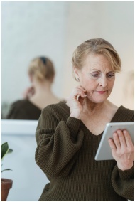 Pensive senior female with cellphone and wrinkled skin touching face against mirror in house room
