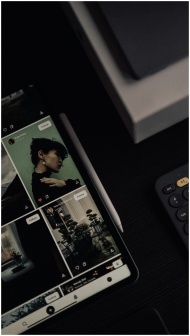 Modern workspace with digital tablet and keyboard featuring social media photos.