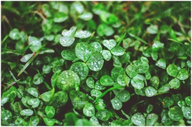 Vivid close-up of lush green clover leaves with delicate water droplets after rain.