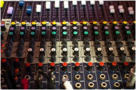 Detailed view of a professional audio mixing console with multicolored knobs in a studio setting.