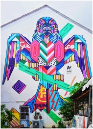 Colorful geometric street art mural on a building in Phuket, Thailand.