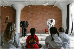 Martial arts teachers bowing to students in a dojo, demonstrating respect and discipline.