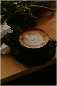 A beautifully crafted latte in a black cup with delicate milk art, accompanied by white flowers on a wooden table.