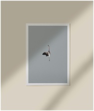 Minimalist artwork of a flamingo in flight, framed against a neutral background.