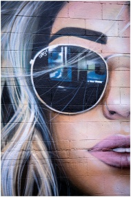Close-up of a colorful mural depicting a woman wearing reflective sunglasses on a brick wall.