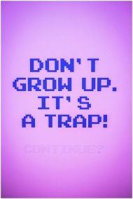 Retro pixel text humorously warns against growing up, on a vivid purple background.