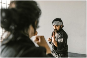 Two martial artists practicing self-defense techni