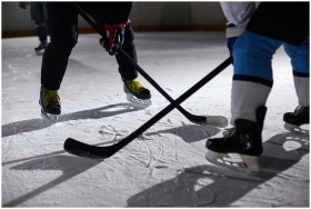 Close-up of hockey players battling for puck durin