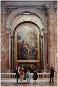 A group of tourists observes a historic painting in a grand Rome art museum.