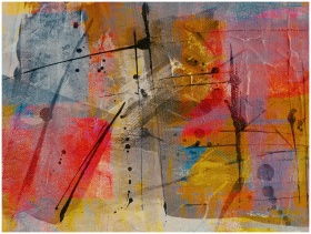 Colorful abstract painting with dynamic strokes and bold colors on canvas.