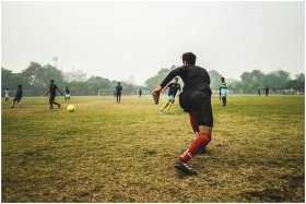 Energetic soccer game with players on a grassy field in India, showcasing teamwork and sportsmanship.