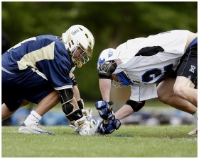 Two male athletes in a lacrosse faceoff during a competitive game on a grassy field.