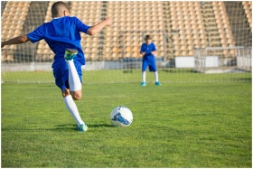 Two boys in blue uniforms practice soccer on a sunny field, focusing on the ball.