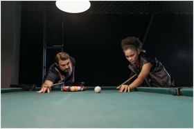 Two people focusing on a game of pool, aiming to m