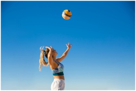 A woman spiking a volleyball on the beach under a clear blue sky, showcasing athletic skill and summer fun.