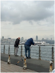 Two men fishing from a pier in İstanbul with city skyline in the background, a ferry passing by.