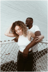 Happy couple smiling and embracing outdoors, showcasing joy and togetherness.
