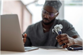 Focused African American doctor in scrubs working with laptop and stethoscope.