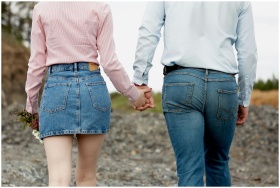 A couple walking hand in hand wearing denim. The s