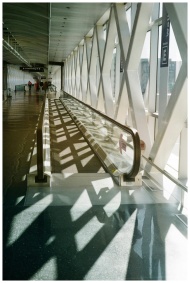 Bright airport corridor featuring a moving walkway and geometric architecture.