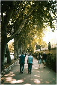 Tourists strolling along a shaded walkway in Istanbul, Türkiye with summer greenery.