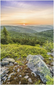 Breathtaking view of a sunrise casting golden hues over a lush green mountain valley with rocky foreground.