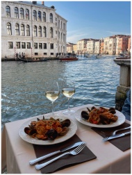 Experience luxury dining by the Venice canals with seafood and white wine.