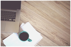 A minimalist workspace featuring a coffee cup, laptop, and wooden desk, offering a productive and stylish environment.