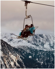 A breathtaking ski lift ride showcasing snow-covered mountains and adventure-seekers in winter.