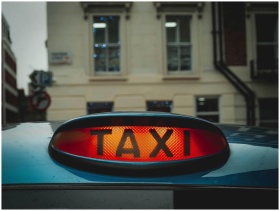 Close-up of an illuminated taxi sign against a London street backdrop, capturing urban vibe.