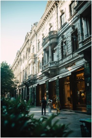 Charming urban scene with a historic building facade and pedestrians, showcasing city life.