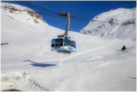 Cable car gliding over snow-covered mountain lands