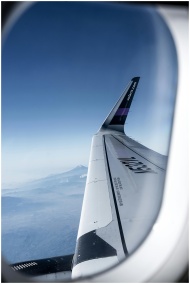 Stunning view of a mountain peak through an airplane window during flight.