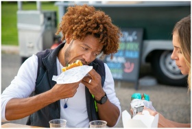 Hungry young African American male with curly hair in casual clothes eating tasty sandwich while spending time with crop girlfriend in street cafe in outskirts