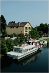 Picturesque scene of a houseboat moored on a tranquil canal in rural France by a charming house.