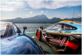 Supercars by a lake with a mountain backdrop, high