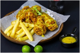 Delicious crispy fried chicken with fries, lime, and dipping sauce on a wooden platter.