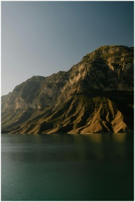 Breathtaking view of a towering mountain against a clear sky, reflecting on serene waters.