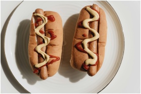 Two hot dogs on a plate topped with ketchup and mustard, ready to eat.