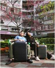 Couple resting with luggage under cherry blossoms