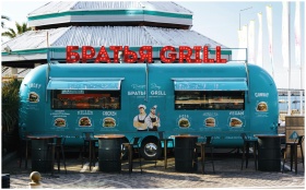 Vibrant blue food truck with Russian signage at a sunny location in Sochi, Russia.