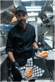 Smiling chef in a food truck presenting gourmet ho