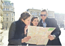 Three tourists exploring a city using a map under